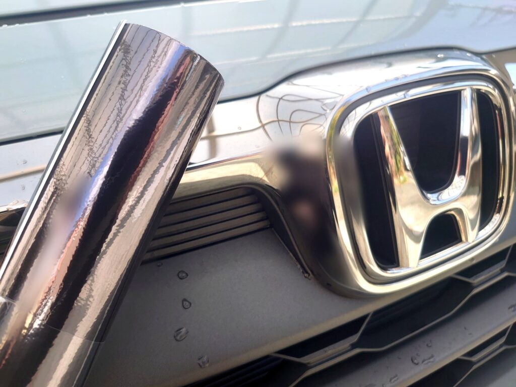 カーラッピングシートは、N-STYLEさんで取扱いされている「高品質鏡面メッキブラック・カーラッピングシート」を使用しました。純正グリルのダーククロームと比べると、濃いめのブラックメッキカラーとなっています。