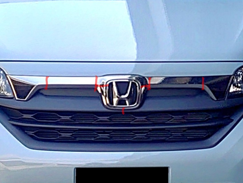 グリル全体を1枚で貼るつもりでしたが、素人の私には難しかったので写真の赤のラインで7分割して貼ることにしました。エンブレム周りは曲面が多いので3分割でないと難しかったです。両サイドのブレード部分は1枚ずつで貼れそうでしたが、シートを浪費してしまい長さが足りなくなったので2分割ずつで貼りました。やはり、シートは余裕を持って用意しておいた方がいいですね。