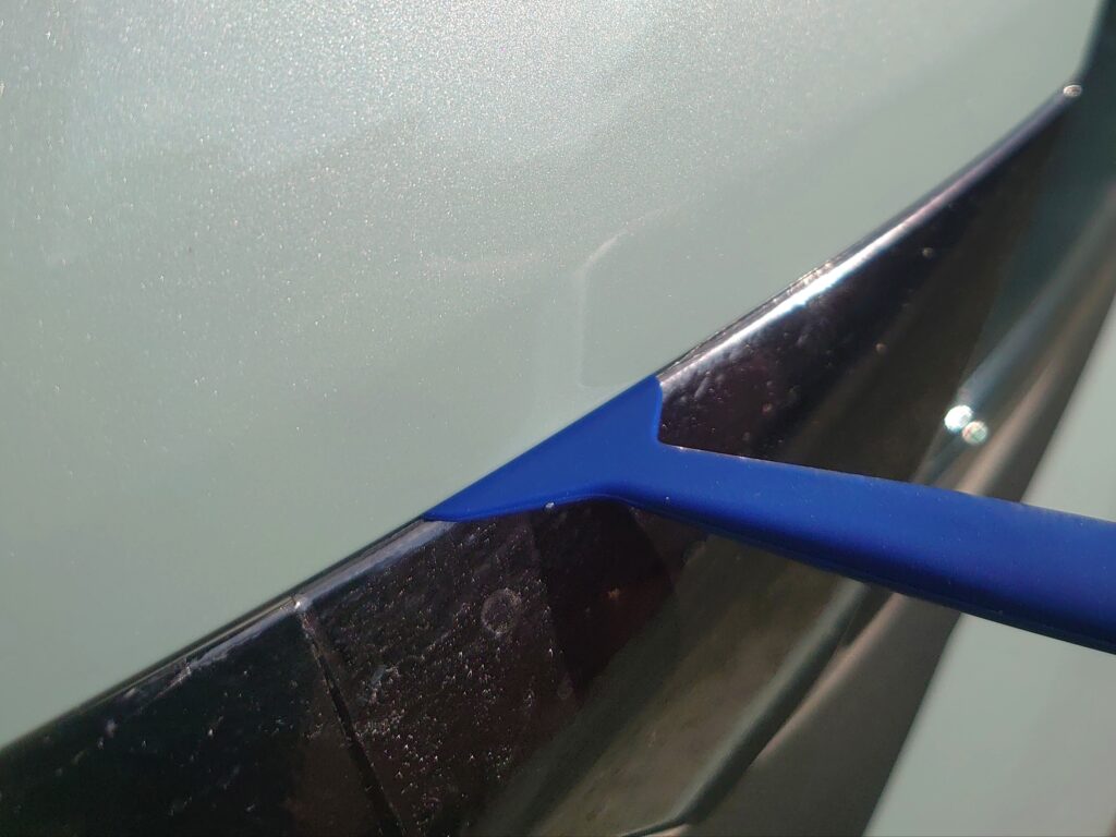 エンブレムの上部分を貼り終えたところです。曲面の多い部分は、分割しながら貼ると貼りやすいですね。