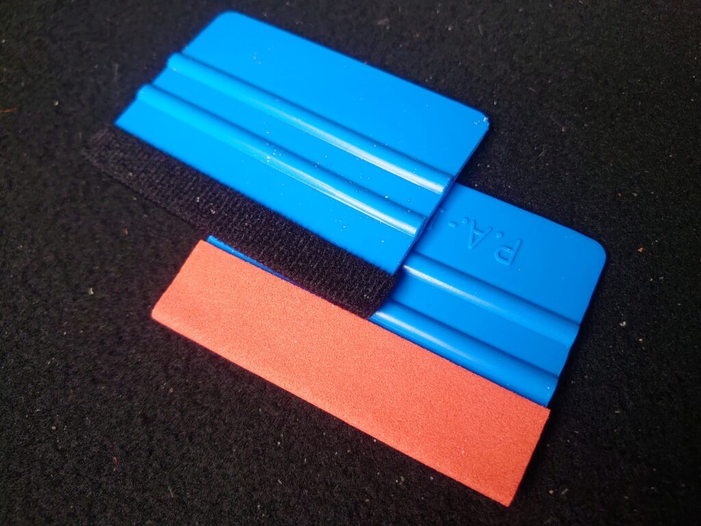 カーラッピング用スキージーには、素材や固さでいくつか種類がありますが、特に定番とも言えるのがフェルト付スキージーです。フェルト付スキージーは、カーラッピングシートの表面を傷付けずに作業できるので、初心者にも扱いやすいとされています。