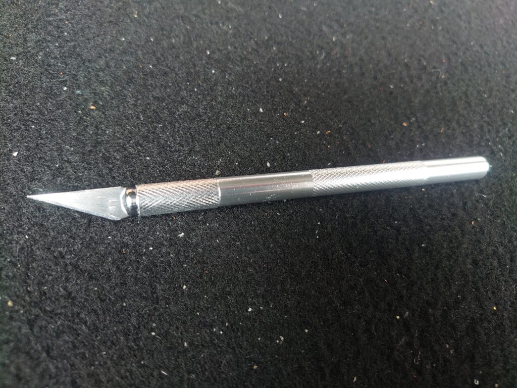 普通のカッターで問題ないですが、ペン型カッター(デザインナイフ)が細かい部分をカットする際には持ちやすく扱いやすいです。