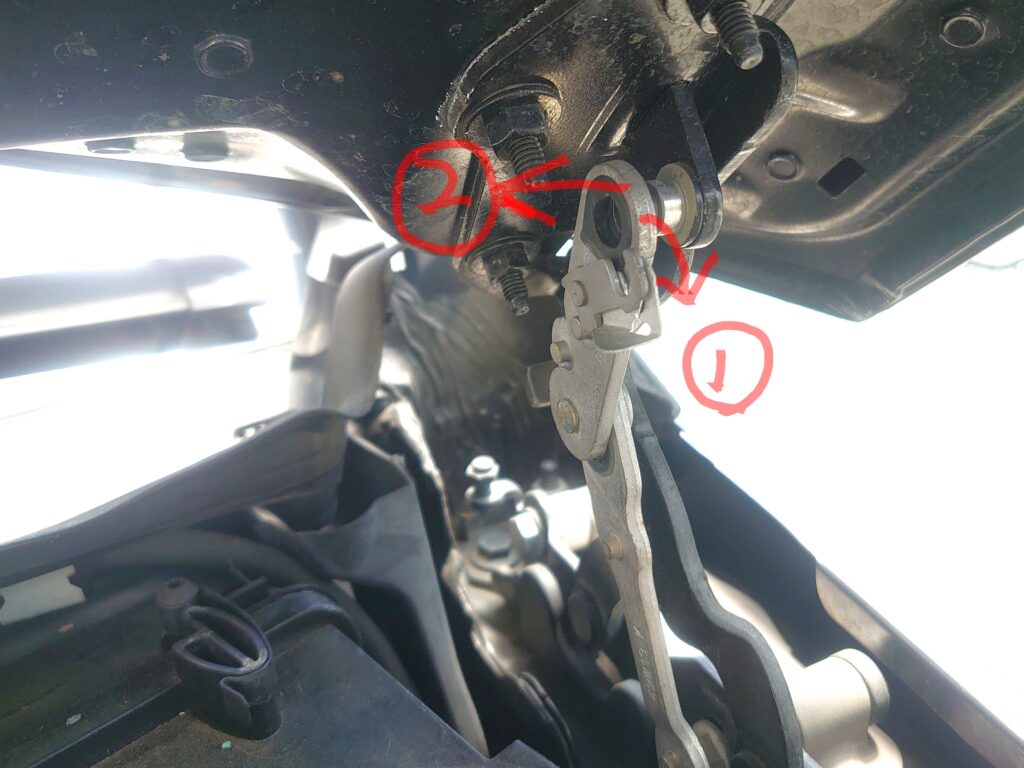 作業がしやすいようにボンネットを垂直に開けるため、写真のシルバーのヒンジのロックを①の方向に外して、②の方向にヒンジを引き抜きます。