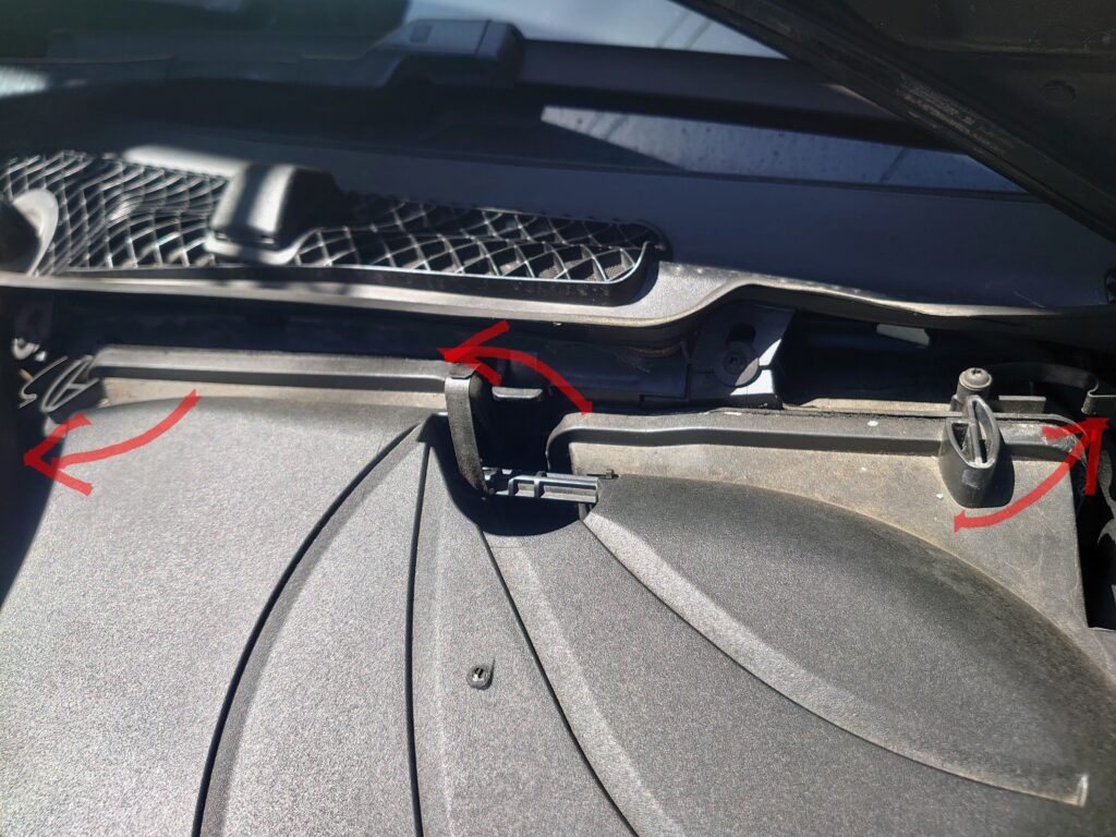 左右両方のシルバーのヒンジを外したら、ボンネットを押し上げて垂直まで開けます。