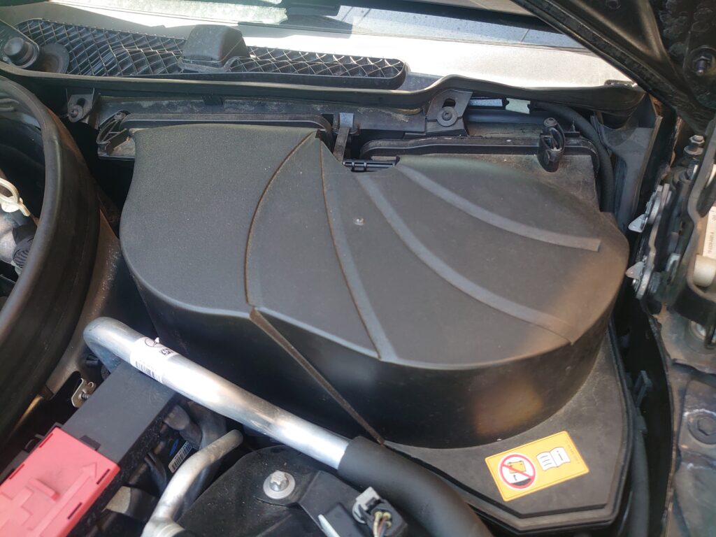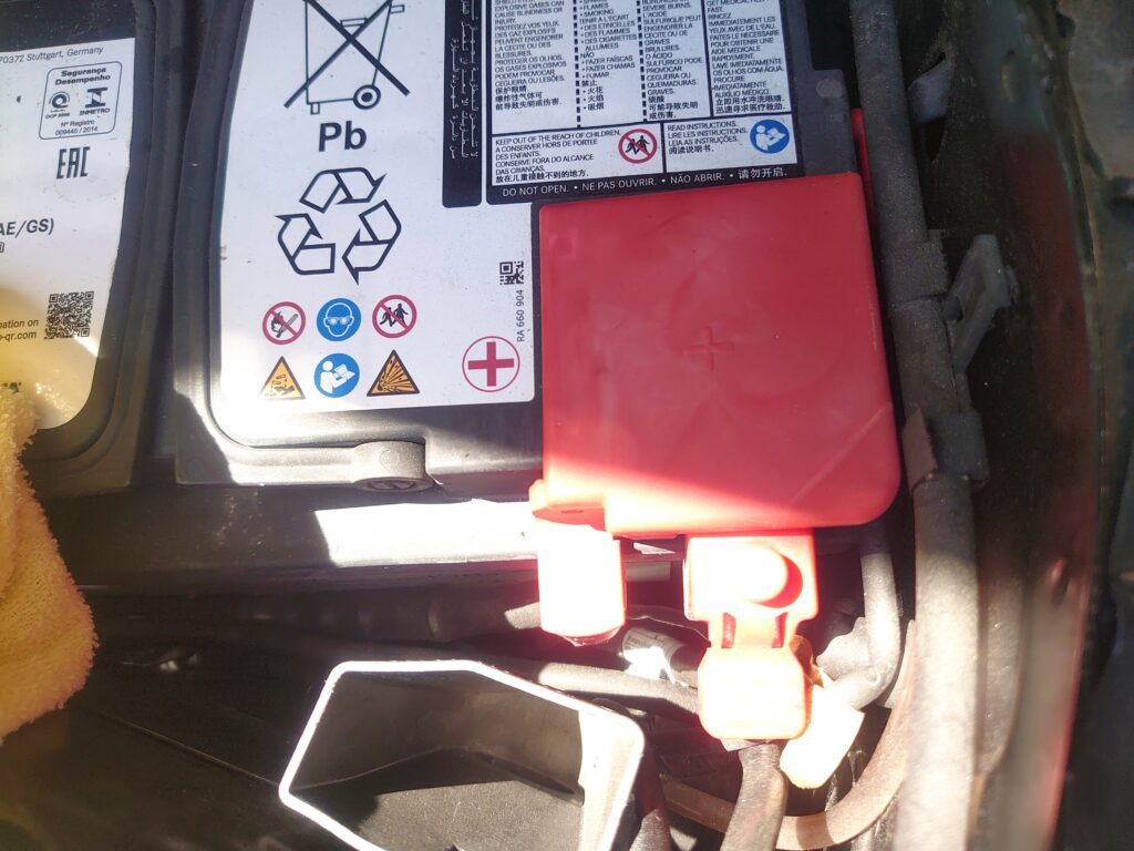ボンネットを開けると、右奥のカバーの下にバッテリーがあります。