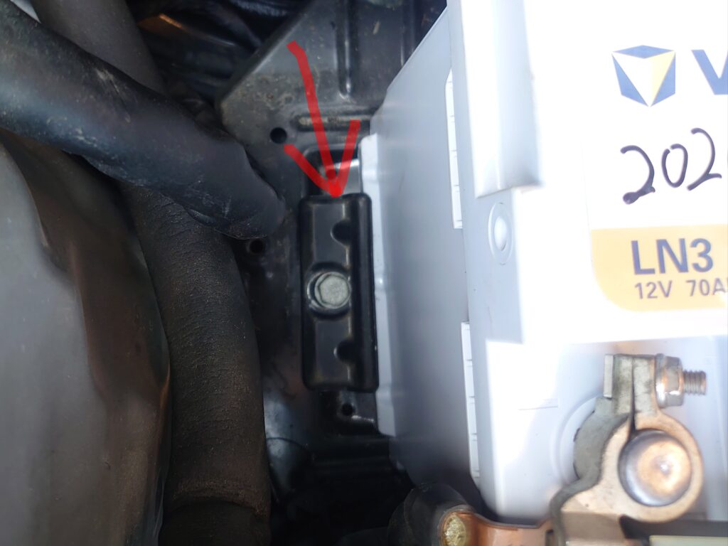 ガス抜きホースと端子を繋いだら、ブラケットを写真のように当てて、ボルトで締めてバッテリーを固定します。今回は、LN3サイズのバッテリーを載せたので手が入るスペースがが生まれ取り付けやすかったですが、LN4だと取り付けに苦戦しそうな予感がしました。