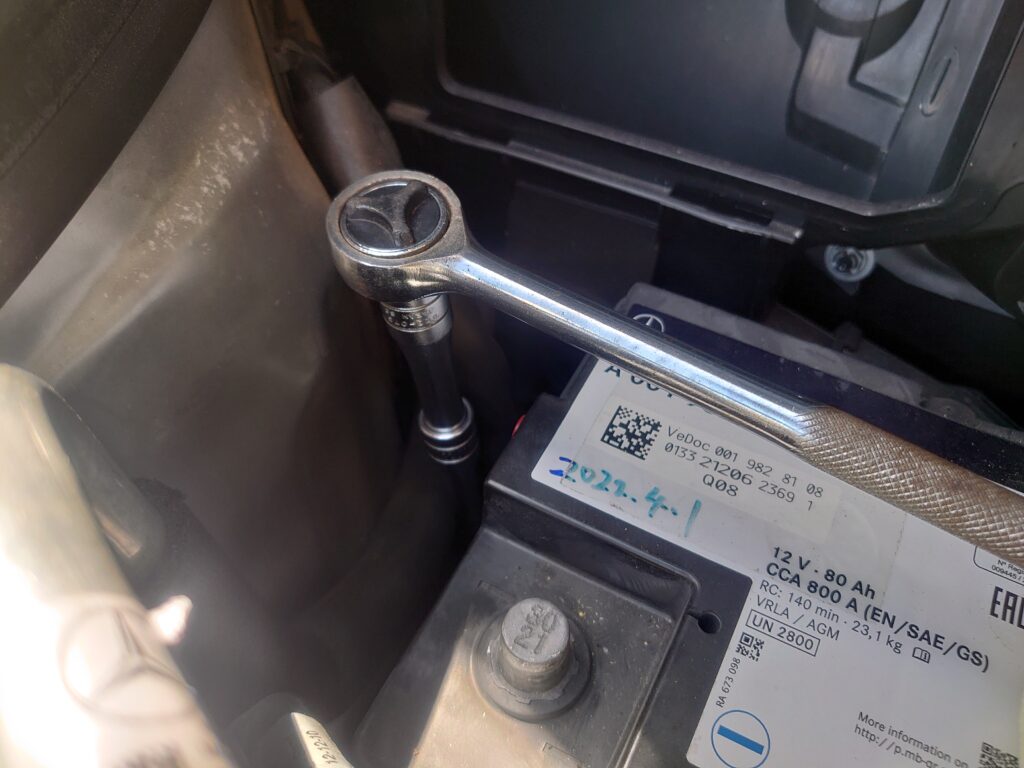 それでは先ず、マイナス端子から外していきます。端子の形状や付け外し方は、国産車とほぼ同じです。10mmのラチェットレンチで固定のボルトを緩め、端子からコードを外して避けておきます。