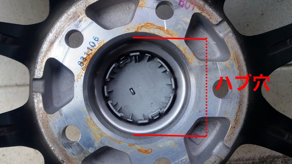 ホイールを裏側から見ると、中心にハブ穴と呼ばれる車両側のセンターハブが嵌まる穴があります。
