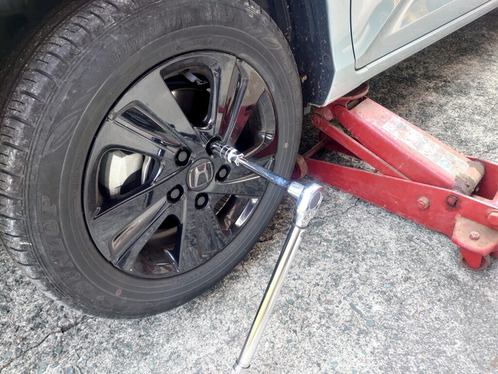 先ずは、安全に十分注意しながら車をジャッキアップし、ホイールナットを外します。