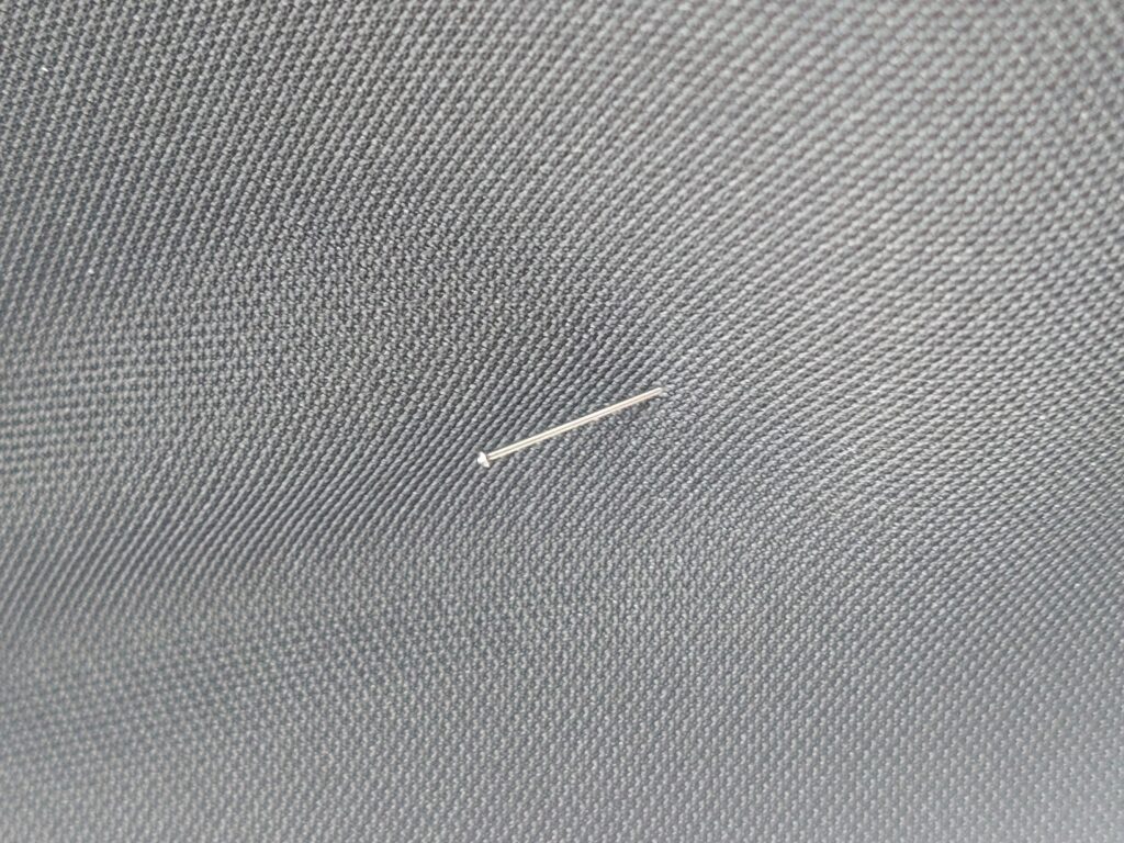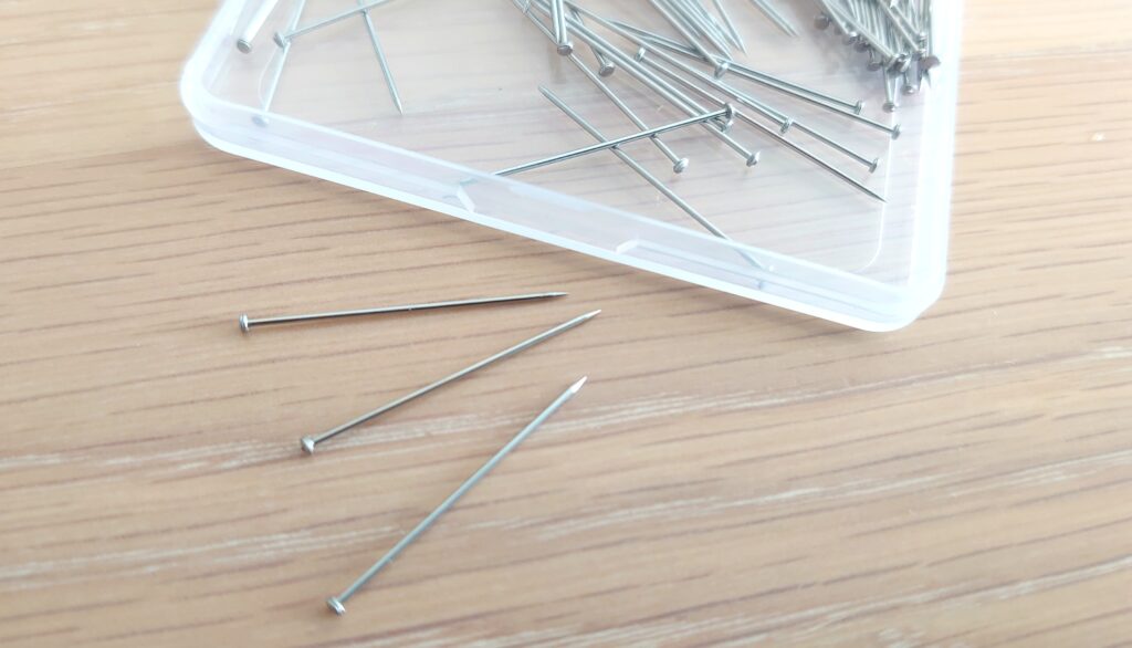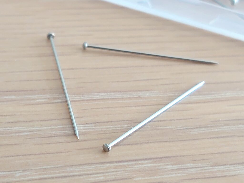 虫ピンは、太さが0.6mm程で頭の部分も小さいので、タッカーやリベットと比べると目立ちにくいと思われます。