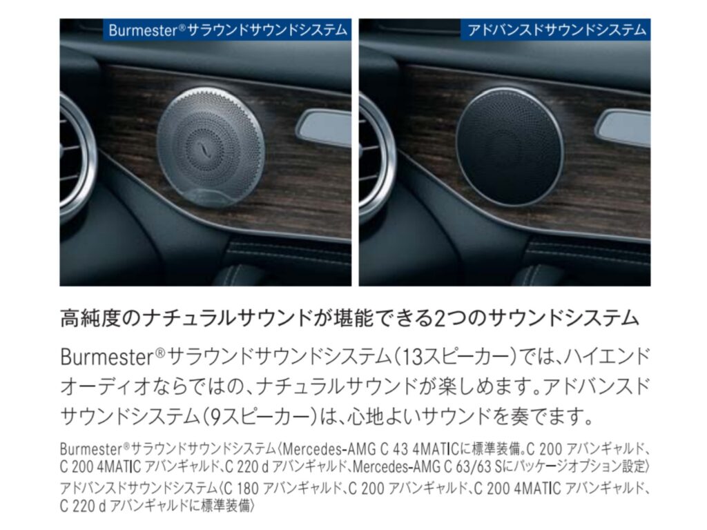 また、2018年7月にビッグマイナーチェンジをした後期型はオーディオの音にも拘って開発されているそうで、後期型アバンギャルドとなるとスピーカー数が異なります。C180は5スピーカーで、C180アバンギャルドはアドバンスドサウンドシステムが標準装備で9スピーカーとなります。C180グレードはオプションのブルメスターサウンドシステムが装着できないので、音に拘りがある場合はアドバンスドサウンドシステムが標準装備の後期型アバンギャルドがオススメです。